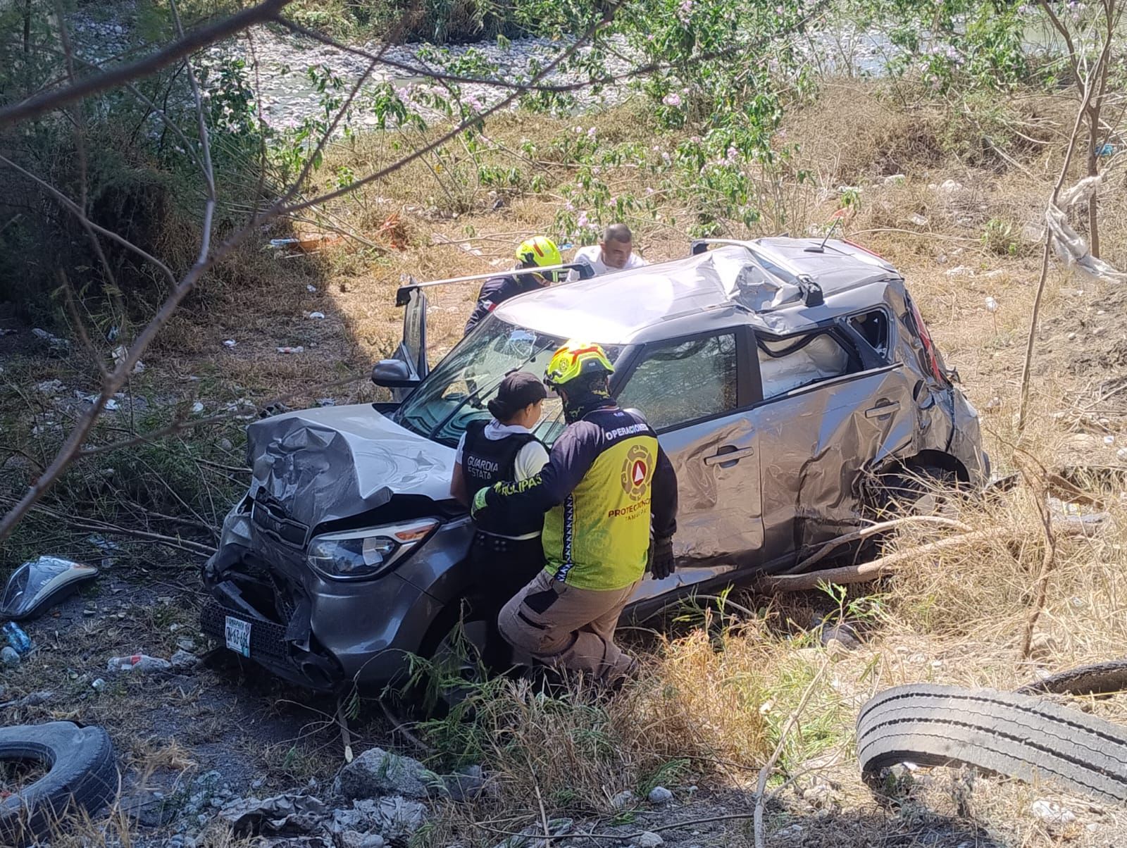 El automóvil, marca Kia, terminó en el lecho del río San Marcos y quedó como pérdida total. Al lugar acudieron paramédicos de la Cruz Roja Mexicana y elementos de Protección Civil del Gobierno del Estado, quienes rescataron a la conductora y a la menor antes de trasladarlas a un hospital para recibir atención médica.