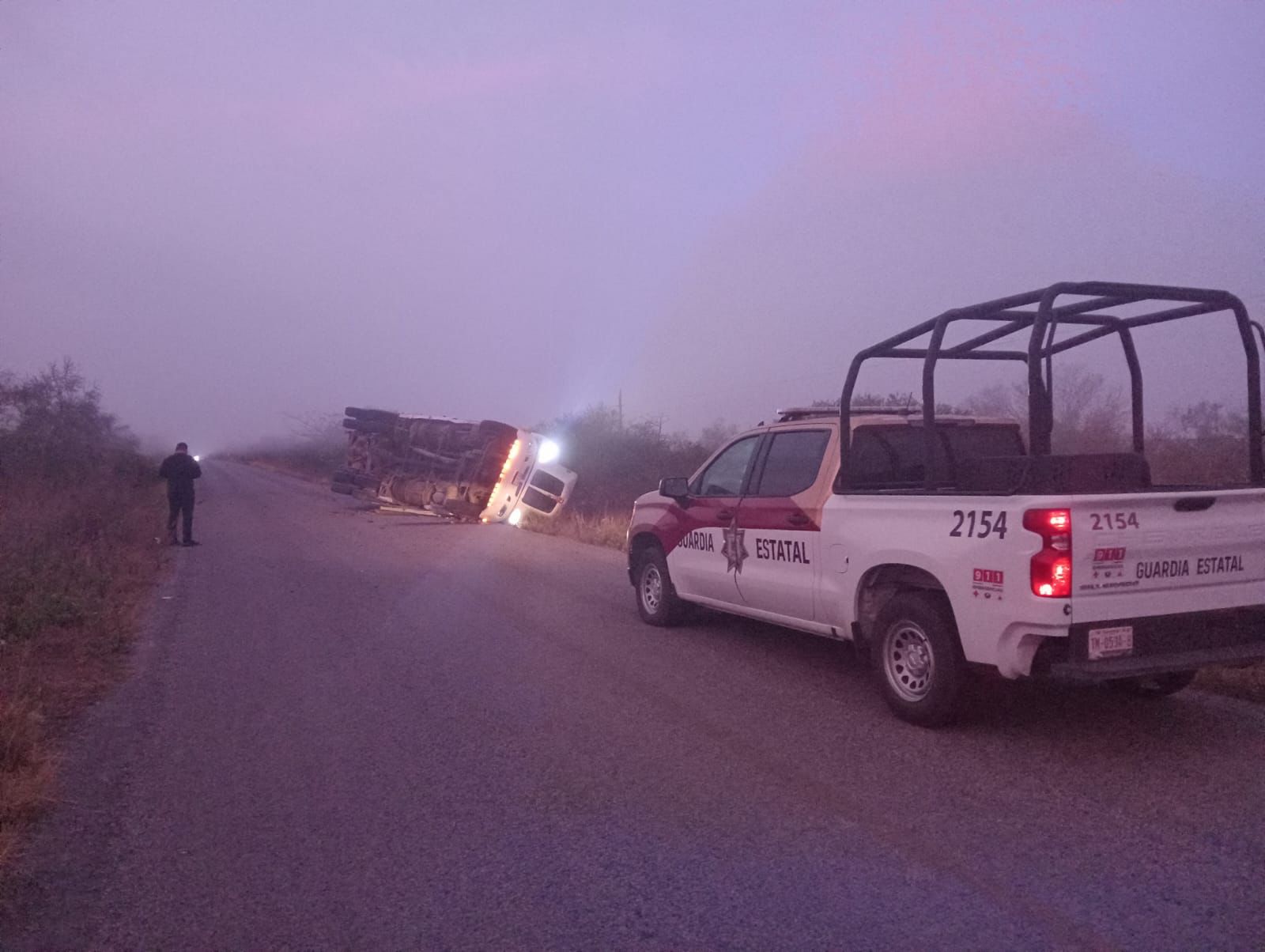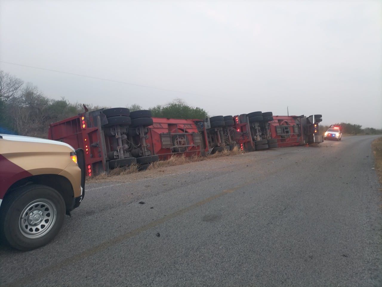 La circulación en la carretera estatal Aldama–Francisco I. Madero se encuentra parcialmente suspendida luego de la volcadura de un tractocamión de doble remolque.