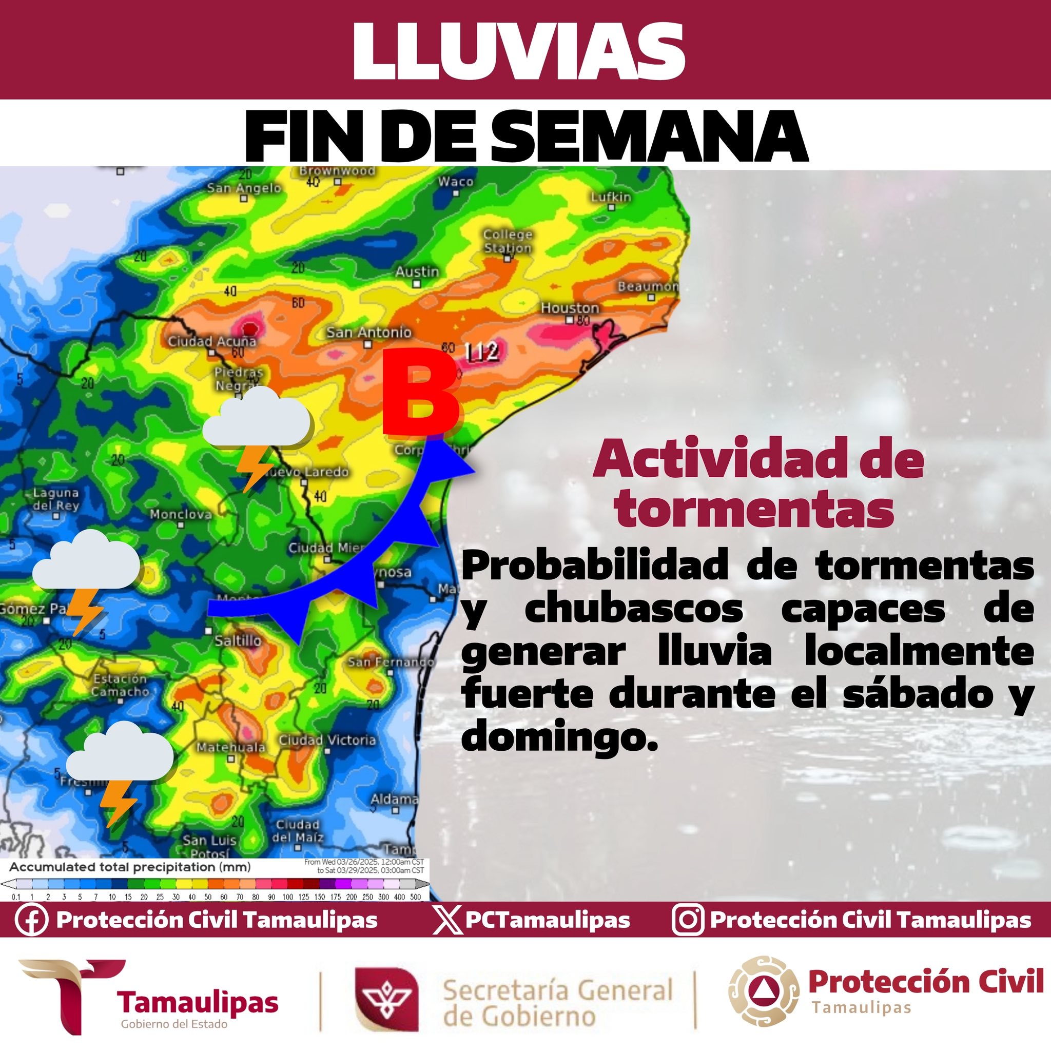 Ciudad Victoria, Tamaulipas (3 de abril de 2026).- Autoridades de Protección Civil en Tamaulipas informaron que se mantiene vigilancia ante el posible ingreso de un frente frío durante el fin de semana, el cual incrementará la inestabilidad atmosférica en la entidad.