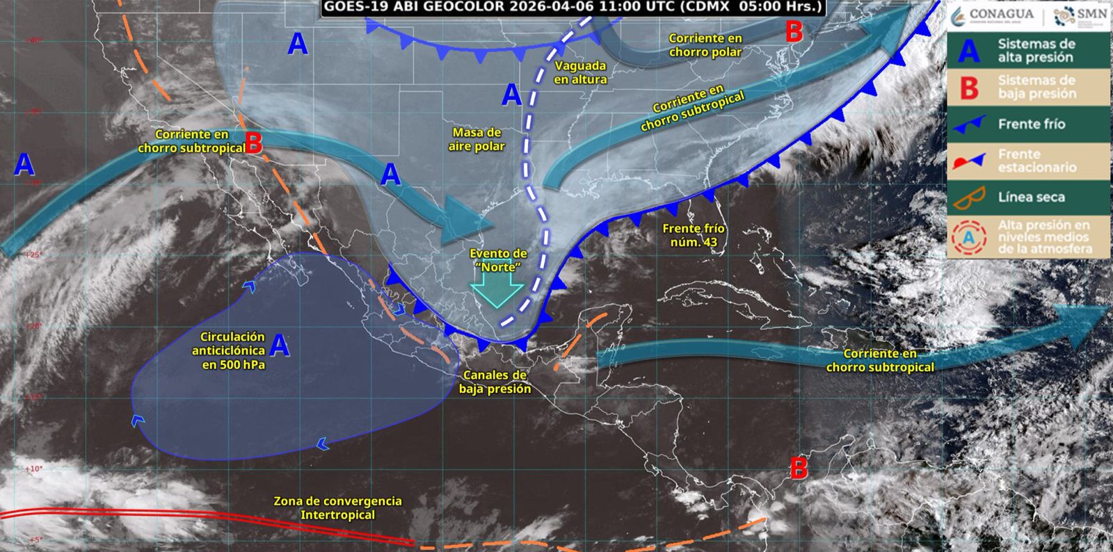 Ciudad Victoria, Tamaulipas (6 de abril de 2026).- El Servicio Meteorológico Nacional (SMN) dio a conocer que la masa de aire polar vinculada al sistema frontal número 43 generará un marcado descenso de las temperaturas en las regiones norte, centro y oriente de la República Mexicana. Para el estado de Tamaulipas, este fenómeno meteorológico provocará un evento de “Norte” con ráfagas de viento que oscilarán entre los 60 y los 80 kilómetros por hora.