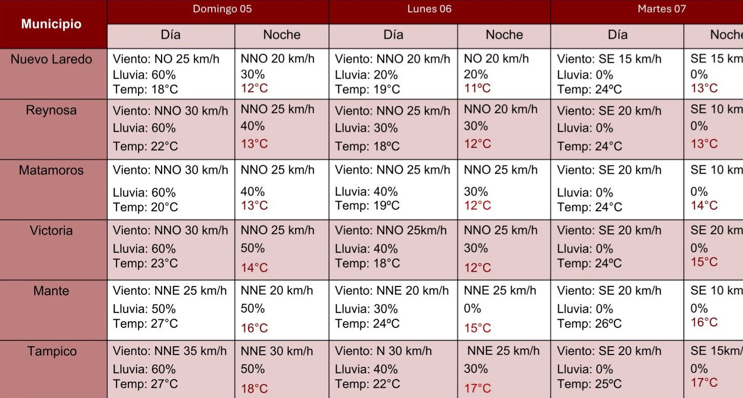 En la zona sur, específicamente en las inmediaciones de Mante y la ruta hacia Zaragoza, las lluvias fuertes de corta duración comenzarán a manifestarse a partir del mediodía del domingo, acompañadas de fuertes ráfagas de viento que podrían complicar el manejo de vehículos de carga y particulares.