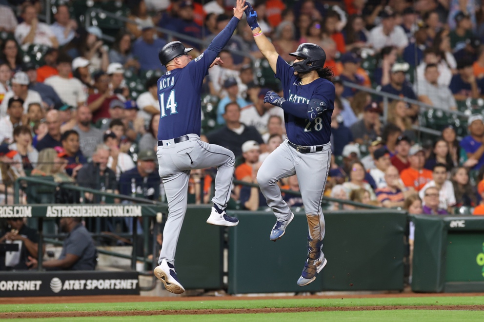 Houston (United States), 07/07/2023.- Seattle Mariners third base coach Manny Acta(L) celebrates with Seattle Mariners third baseman Eugenio Suarez(R) after Suarez hits a solo home run against Houston Astros relief pitcher Rafael Montero during the ninth inning of the Major League Baseball (MLB) game between the Seattle Mariners and Houston Astros in Houston, Texas, USA, 06 July 2023. (Estados Unidos) EFE/EPA/ADAM DAVIS