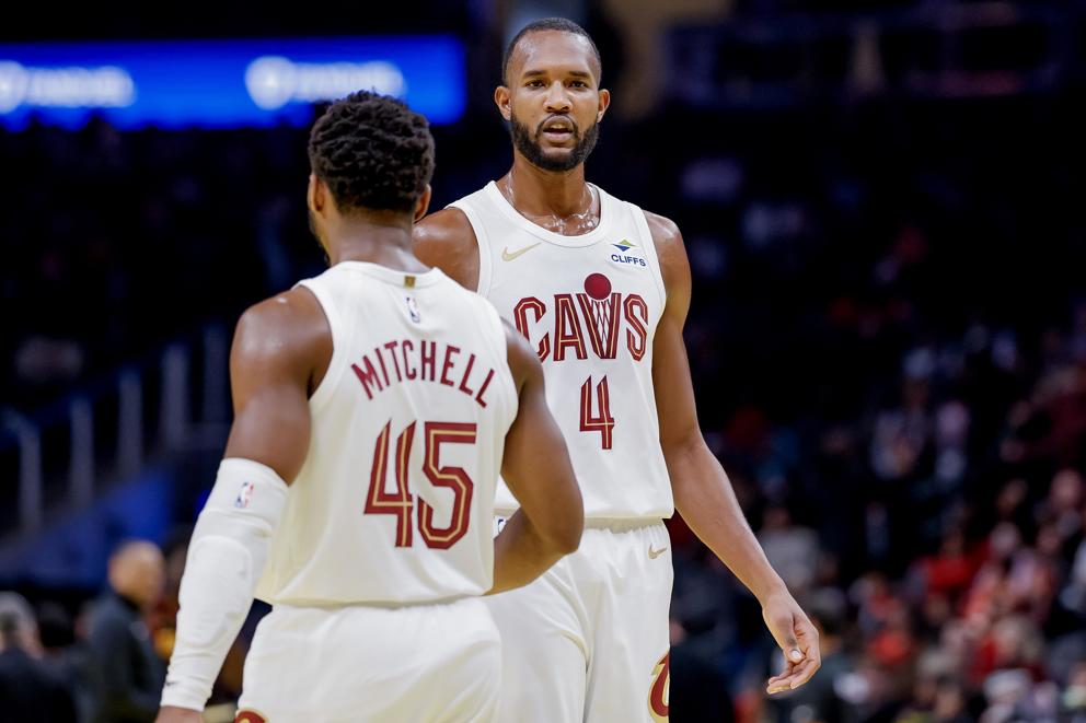 Atlanta (United States), 29/11/2024.- Cleveland Cavaliers forward Evan Mobley (R) reacts with Cleveland Cavaliers guard Donovan Mitchell (L) during the first half of an NBA Cup tournament basketball game between the Cleveland Cavaliers and the Atlanta Hawks in Atlanta, Georgia, USA, 29 November 2024. (Baloncesto) EFE/EPA/ERIK S. LESSER SHUTTERSTOCK OUT