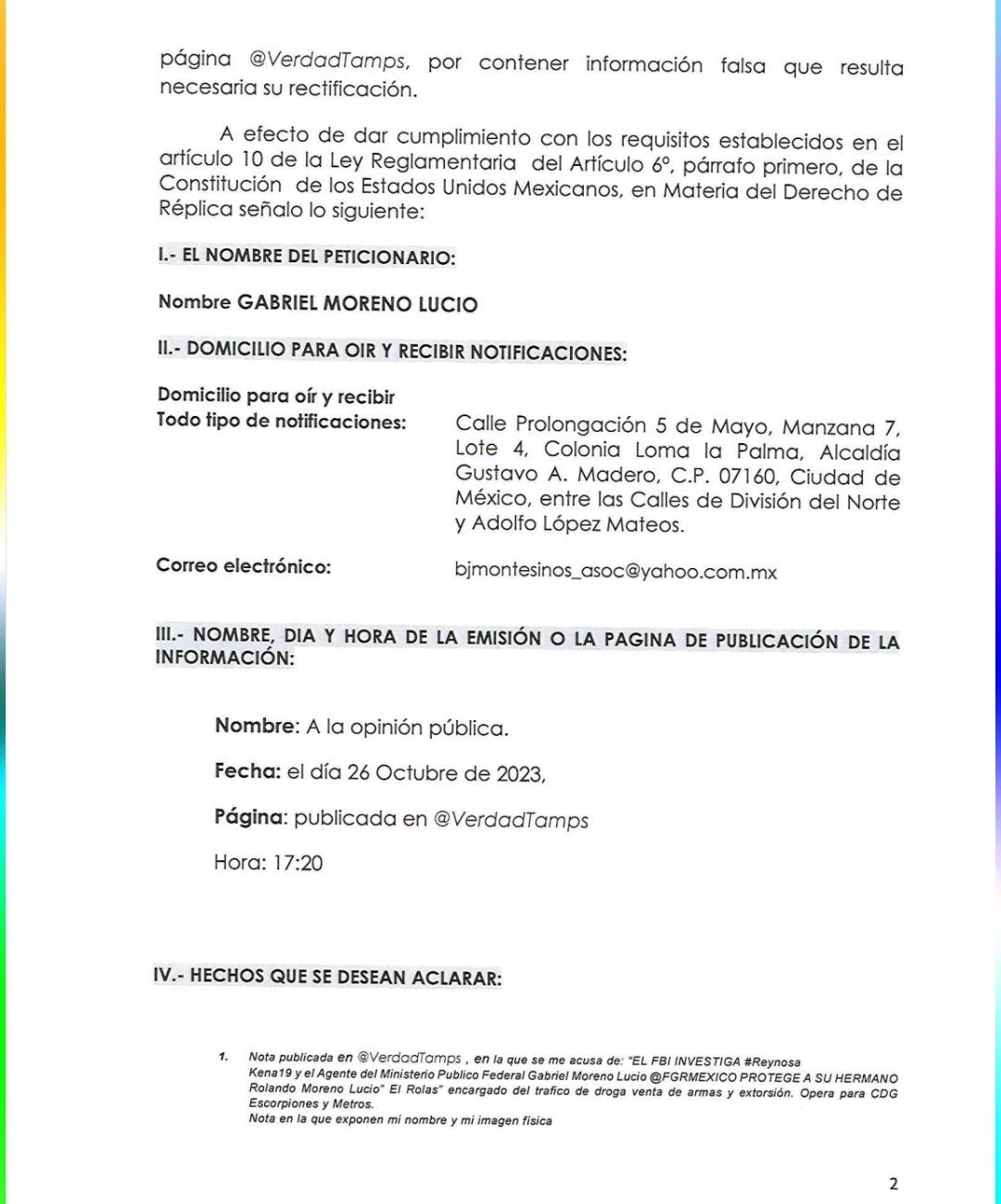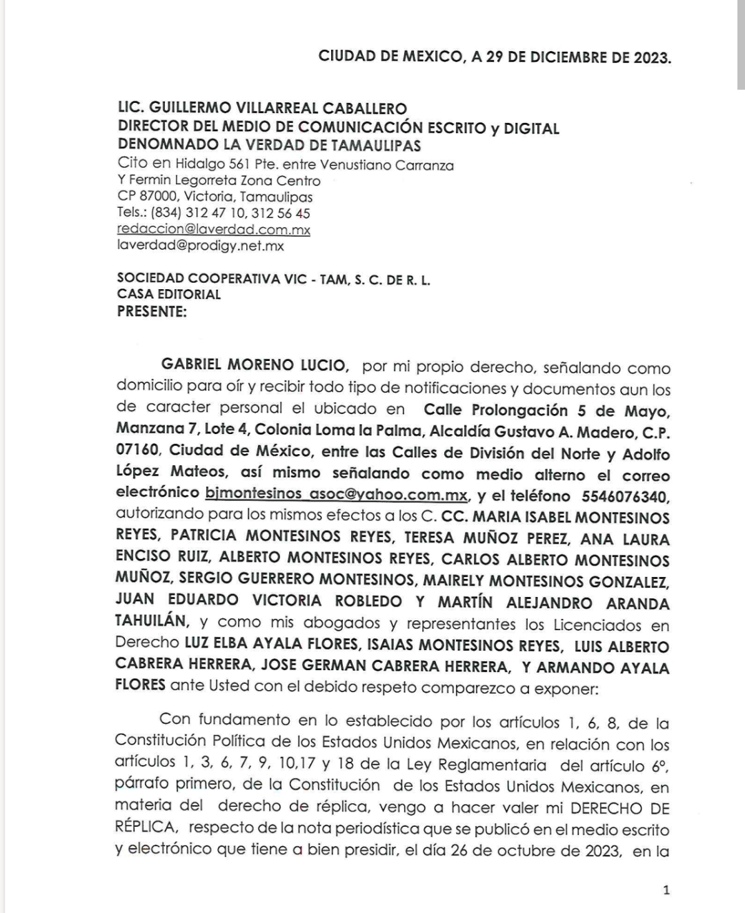 Ciudad Victoria, Tamaulipas (29 de diciembre de 2023).- Ante el derecho de réplica reclamado por el C. Gabriel Moreno Lucio, el periódico digital La Verdad de Tamaulipas se deslinda de la publicación reclamada por el interesado, señalando que nuestro medio se puede consultar en la siguiente dirección electrónica: www.laverdad.com.mx, no así en @VerdadTamps, medio este último que no pertenece a esta casa editorial.